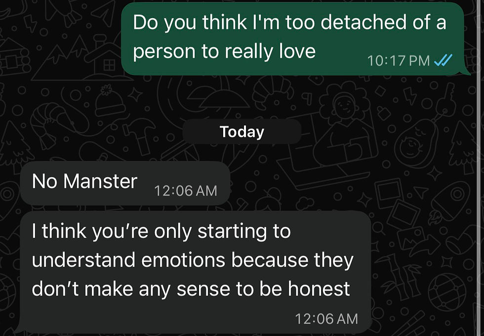 She says “Iman, have you ever thought that you are so averse to putting yourself out there and trusting someone, that the only way you can stomach doing it is if loving the person is literally out of your control ?”